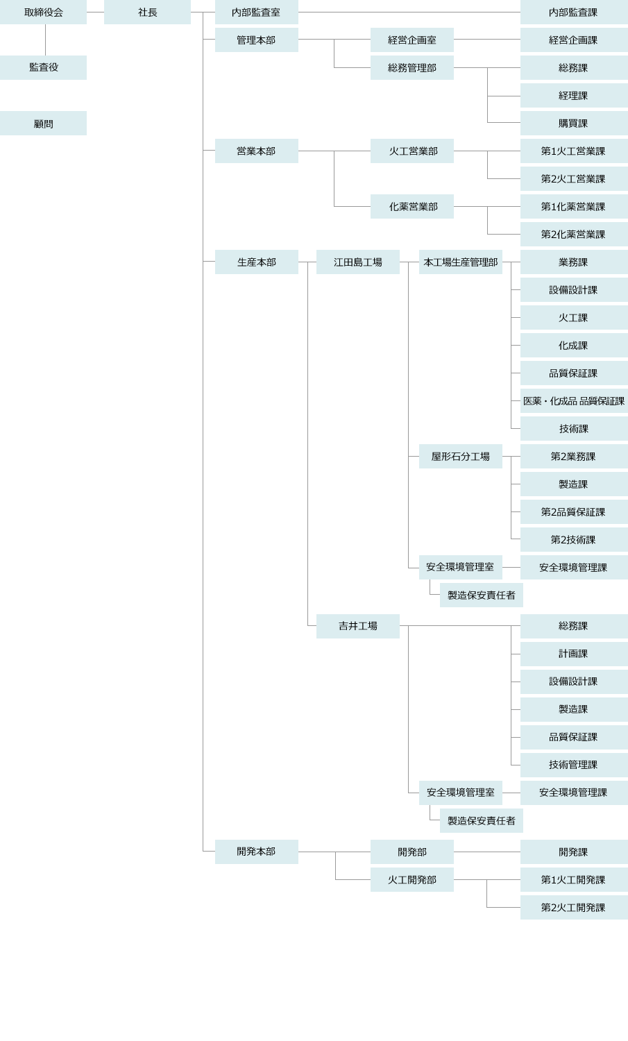 | 営業種目 | 防衛火工品、産業火薬品、工業薬品の製造及び販売、医薬品の製造及び販売、清涼飲料水の販売、 火薬類・危険物等の処理作業、施設の賃貸 |